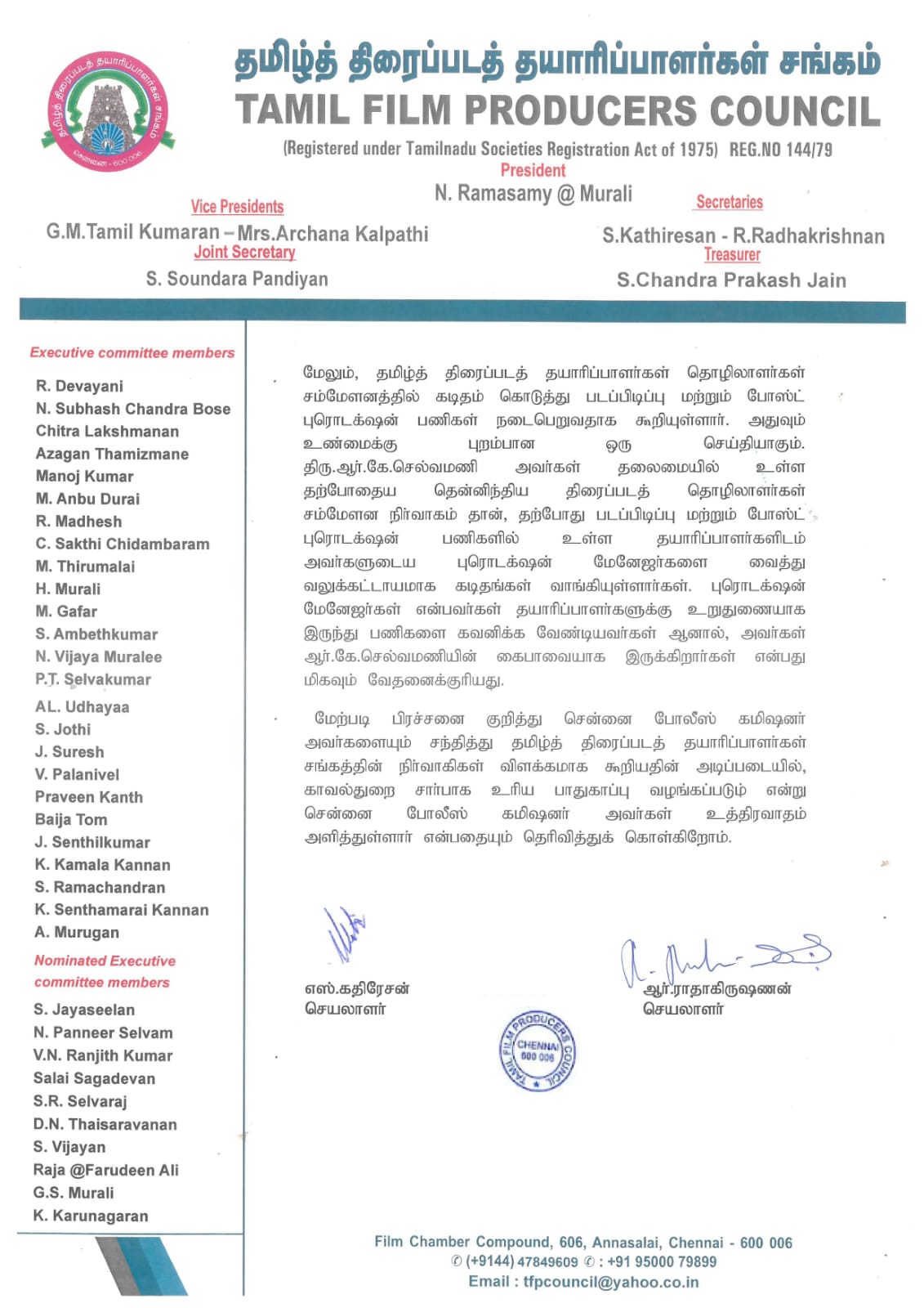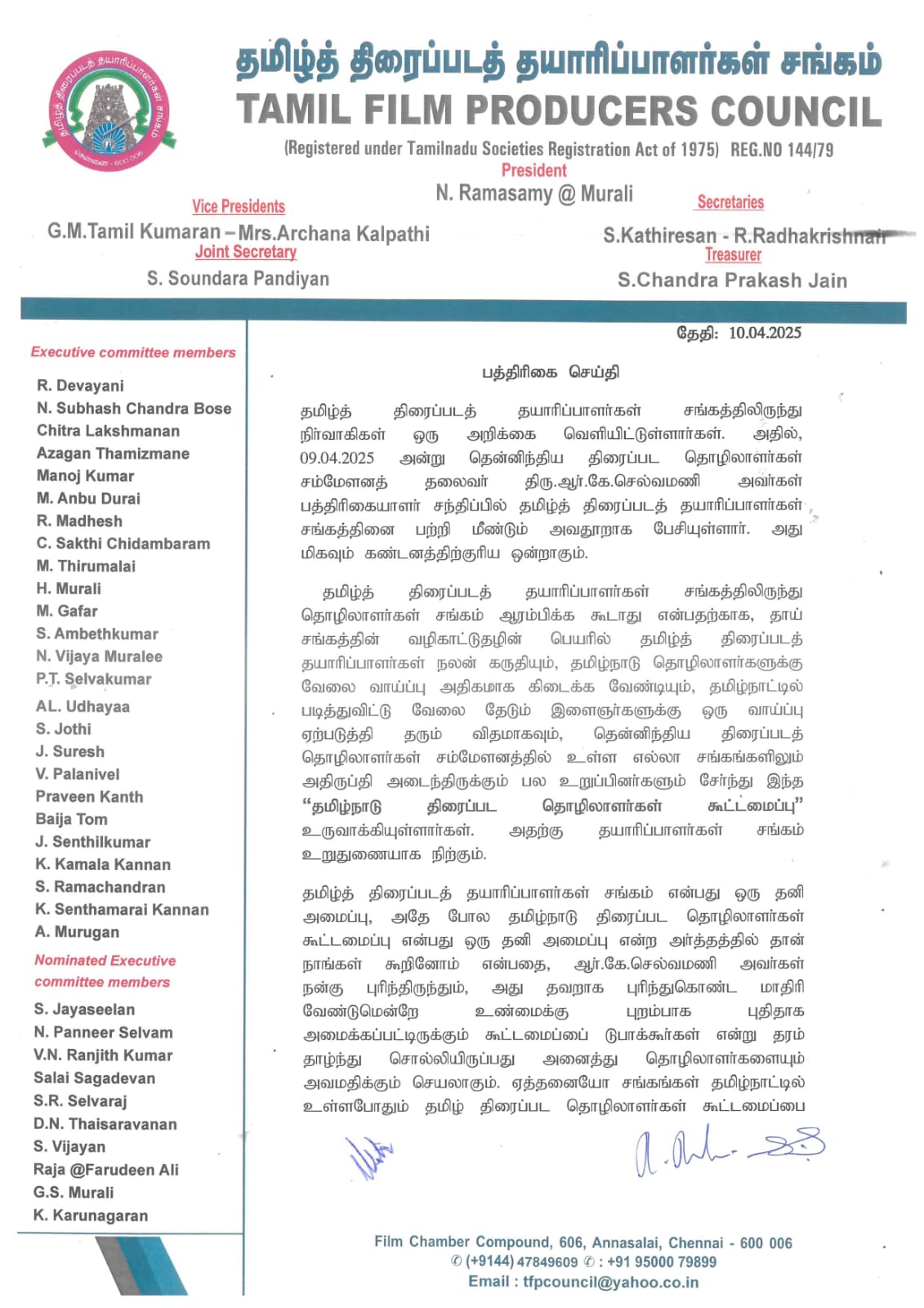 தமிழ் திரைப்பட தயாரிப்பாளர் சங்கத்திலிருந்து நிர்வாகிகள் ஒரு அறிக்கை வெளியிட்டுள்ளார்கள் அதில் 09.04. 2025 அன்று தென்னிந்திய திரைப்பட தொழிலாளர்கள் சம்மேளன தலைவர் திரு ஆர் கே செல்வமணி அவர்கள் பத்திரிகையாளர் சந்திப்பில் தமிழ் திரைப்பட தயாரிப்பாளர் சங்கத்தினை பற்றி மீண்டும் அவதூறாக பேசியுள்ளார் அது மிகவும் கண்டனத்துக்குரிய ஒன்றாகும்.