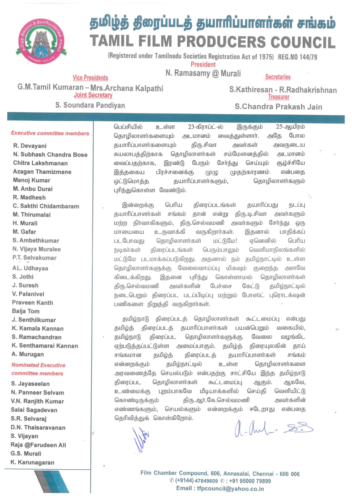 இன்றைக்கு பெரிய திரைப்படங்கள் தயாரிப்பது நடப்பு தயாரிப்பாளர்கள் சங்கம் தான் என்று டி சிவா அவர்களும் மற்ற நிர்வாகிகளும் திரு செல்வமணி அவர்களும் சேர்ந்து ஒரு மாயையை உருவாக்கி வருகிறார்கள். இதனால் பாதிக்கப்பட போவது தொழிலாளர்கள் மட்டுமே ஏனெனில் பெரிய நடிகர்களின் திரைப்படங்கள் பெரும்பாலும் வெளி மாநிலங்களில் மட்டுமே படமாக்கப்படுகிறது. அதனால் நம் தமிழ்நாட்டில் உள்ள தொழிலாளர்களுக்கு வேலைவாய்ப்பு மிகவும் குறைந்த அளவே கிடைக்கிறது இதனை புரிந்து கொள்ளாமல் தொழிலாளர்கள் திரு செல்வமணி அவர்களின் பேச்சைக் கேட்டு தமிழ்நாட்டில் நடைபெறும் திரைப்பட படப்பிடிப்பு மற்றும் போஸ் ப்ரடெக்ஷன் பணிகளை நிறுத்தி வருகிறார்கள்.